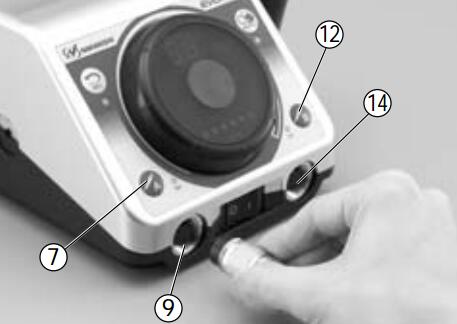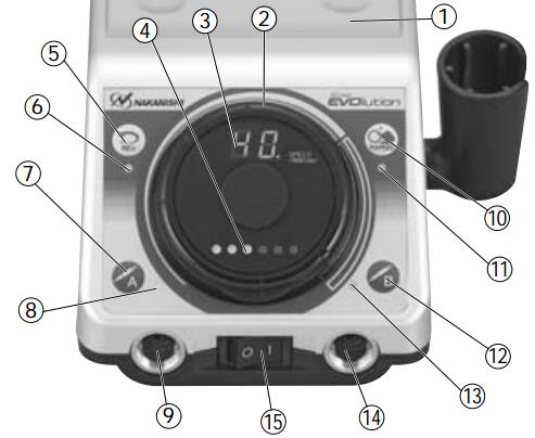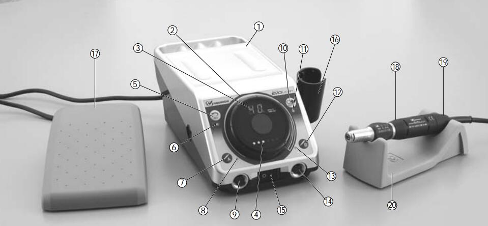 1.機(jī)體電源 2.轉(zhuǎn)速調(diào)整盤 3.轉(zhuǎn)速顯示 4.LED 負(fù)荷顯示燈 5.反轉(zhuǎn)按鍵 6.反轉(zhuǎn)LED 顯示燈 7.開關(guān)按鍵A 8.打磨筆A 啟動LED 顯示燈 9.打磨筆連接插口A 10.轉(zhuǎn)速固定 11.轉(zhuǎn)速固定LED 顯示燈 12.開關(guān)按鍵B 13.打磨筆A 啟動LED 顯示燈B 14.打磨筆連接插口B 15.電源開關(guān) 16.打磨筆放置插架 17.腳踏開關(guān)(選配) 18.打磨筆 19.按鍵開關(guān) 20.打磨筆放置架 |