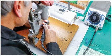 小的唱片針,最大的有45個(gè)零件組成,針尖是米粒小,肉眼看不到,因此用顯微鏡放大鏡等作業(yè)。記錄針懸臂的修理,使用的是中西NAKANISHI研磨機(jī)E-MAX系列,常用的套裝是EV410-230.