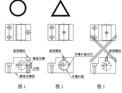 有關(guān)安裝支架上時(shí),如圖-1所示建議使用螺旋開槽支架安裝方法。如果圖-1的方法不能安裝時(shí),請(qǐng)按照?qǐng)D-2的方法進(jìn)行安裝。 如圖3所示直接安裝螺絲時(shí),會(huì)使主軸外套變形造成旋轉(zhuǎn)不良或發(fā)熱的原因. |