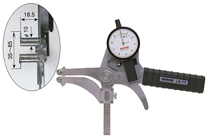 孔雀peacock帶表外卡規(guī)LB-3,測量范圍10-30mm,最小讀值0.01mm,測定喉深50mm,指示誤差±0.03mm,測頭高度2mm,適用于難以測量的內(nèi)徑和溝槽寬度使用。
